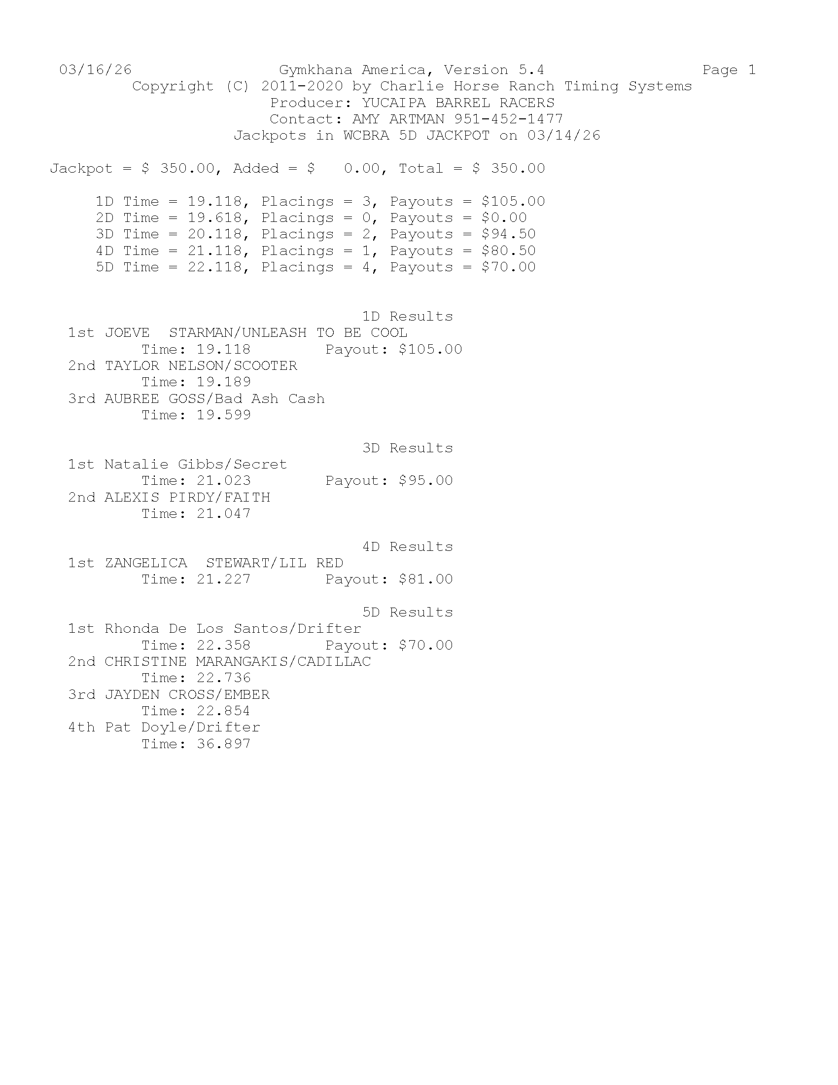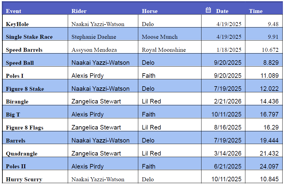 2026 Season Results YBR Jackpot Race 3/14/26 Jan 17 Jackpot Results Feb 21 Jackpot Results Times and Winners List Jan 17th Gymkhana Show Results Feb 21st Gymkhana Show Result Mar 14th Gymkhana Show Result Current PointsAs of3/14/2026 Event Records Times by Rider Times by Event Past Season Show Results 2025